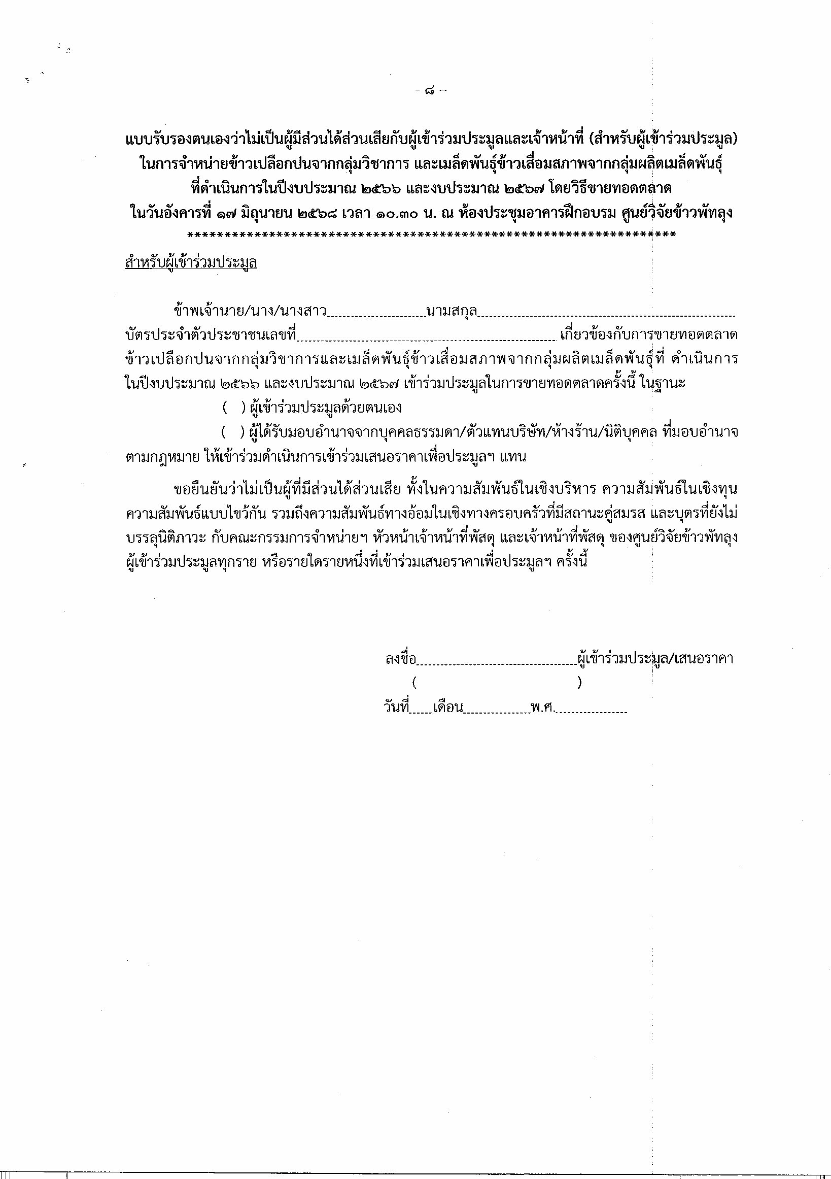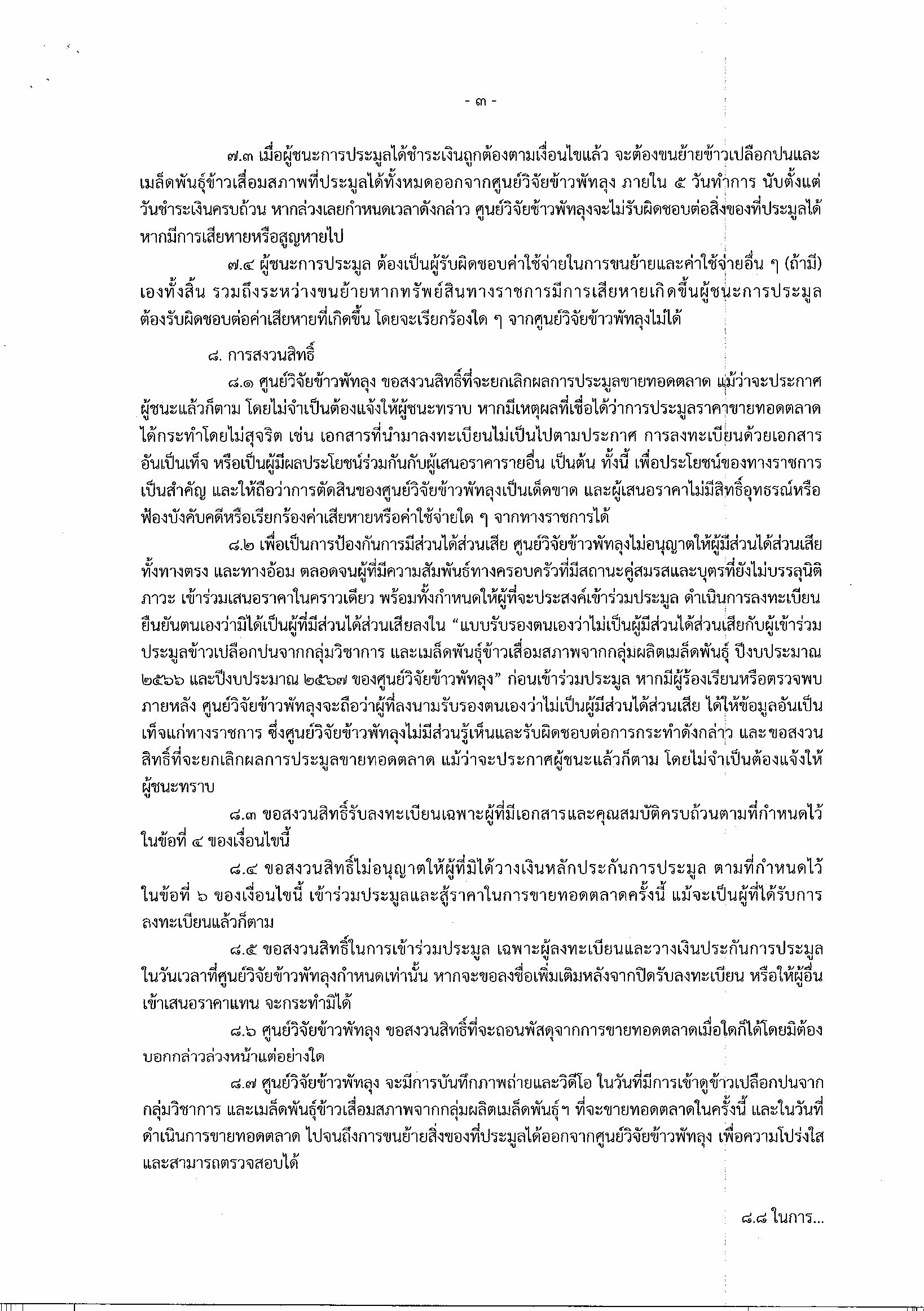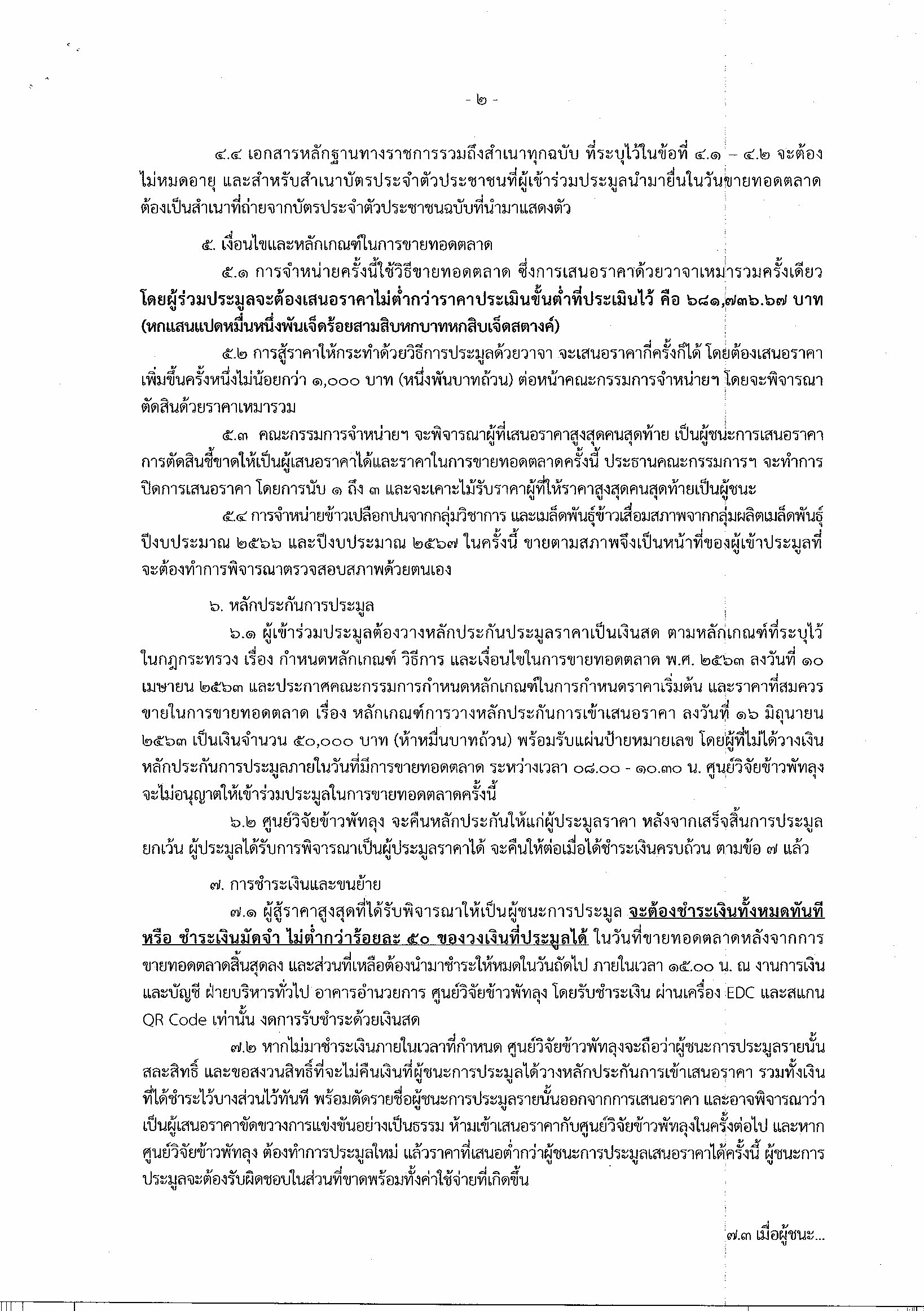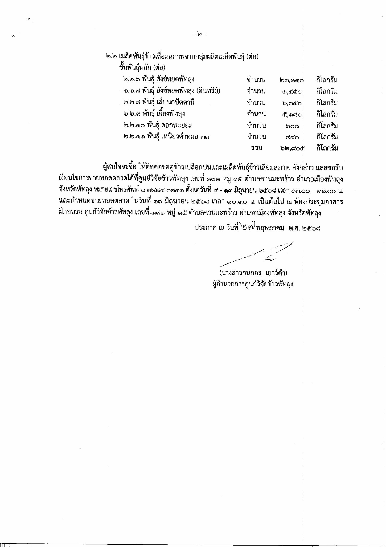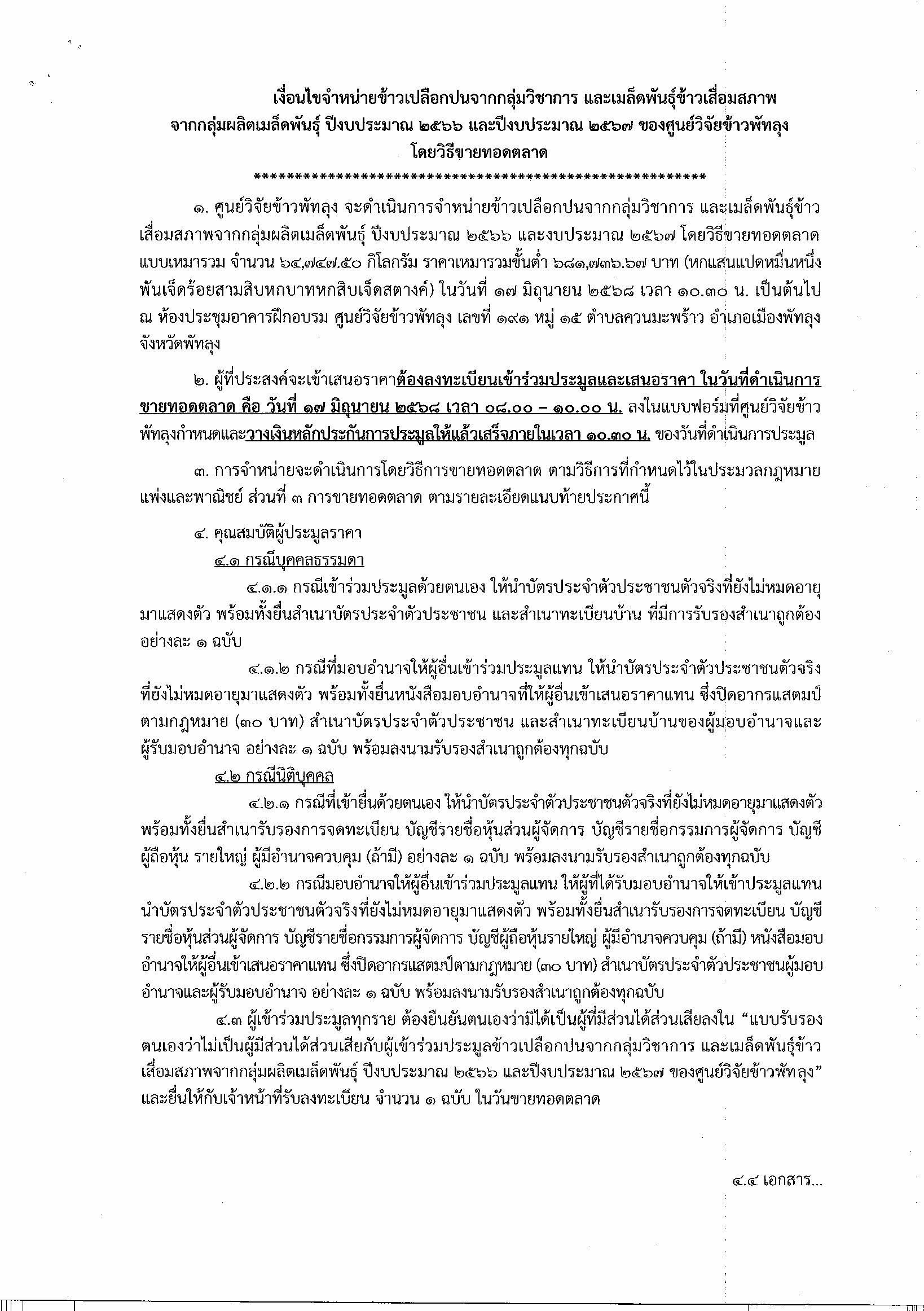 ประกาศศูนย์วิจัยข้าวพัทลุง เร่ื่อง จำหน่วยข้าวเปลือกปนจากกลุ่มวิชาการและเมล็ดพันธุ์ข้าวเสื่อมคุณภาพจากกลุ่มผลิตเมล็ดพันธุ์ ที่ดำเนินการในปีงบประมาณ 2566 และปีงบประมาณ 2567 โดยวิธีขายทอดตลาด