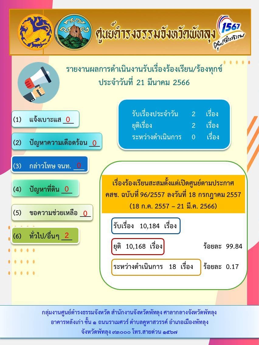สถิติรับเรื่องร้องเรียน/ร้องทุกข์ วันที่ 21 มีนาคม 2566