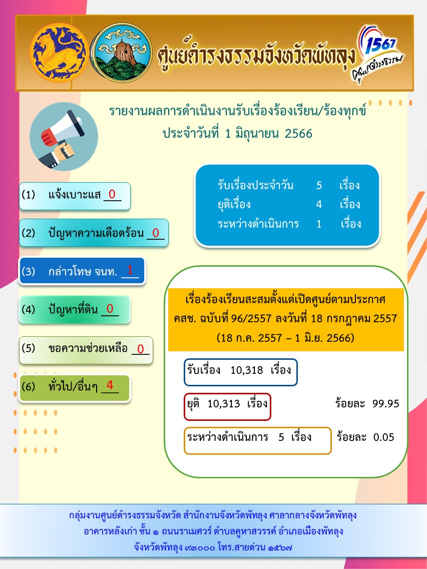 สถิติรับเรื่องร้องเรียน/ร้องทุกข์ วันที่ 1 มิถุนายน 2566