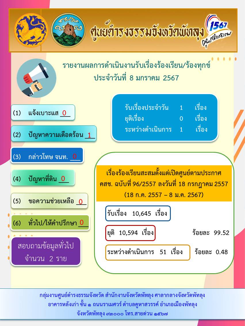 สถิติรับเรื่องร้องเรียน/ร้องทุกข์ วันที่ 8 มกราคม 2567