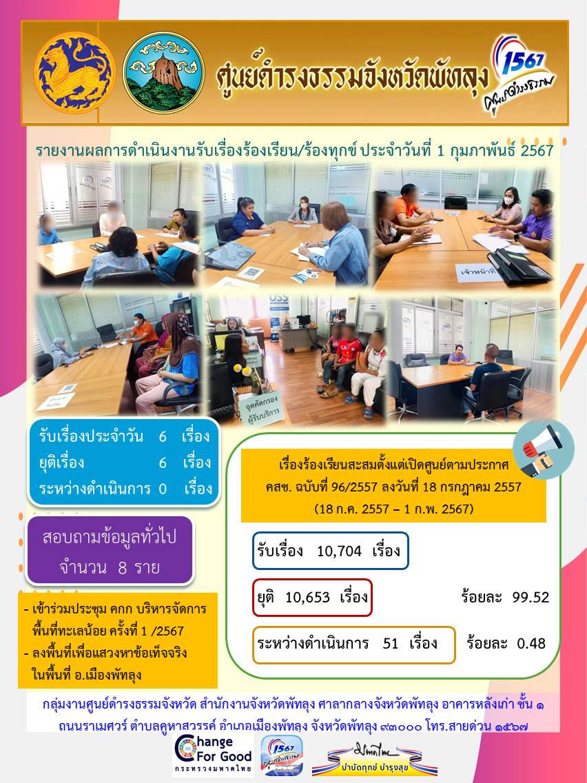 สถิติรับเรื่องร้องเรียน/ร้องทุกข์ วันที่ 1 กุมภาพันธ์ 2567
