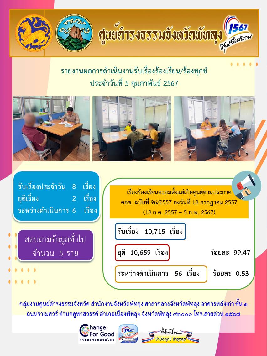 สถิติรับเรื่องร้องเรียน/ร้องทุกข์ วันที่ 5 กุมภาพันธ์ 2567