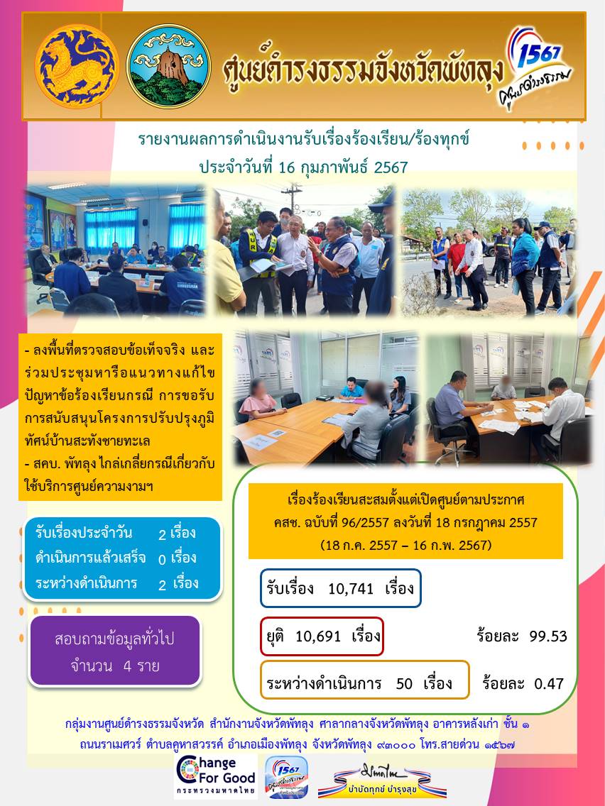 สถิติรับเรื่องร้องเรียน/ร้องทุกข์ วันที่ 16 กุมภาพันธ์ 2567