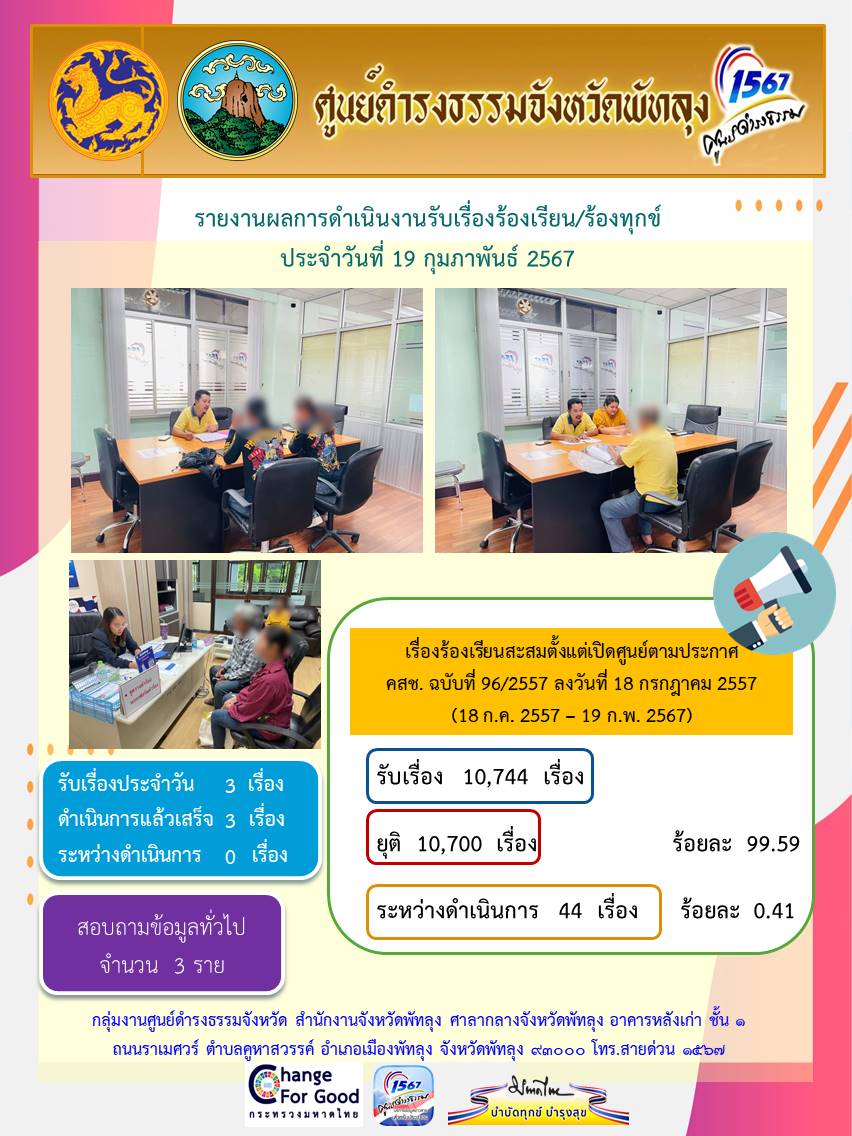 สถิติรับเรื่องร้องเรียน/ร้องทุกข์ วันที่ 19 กุมภาพันธ์ 2567