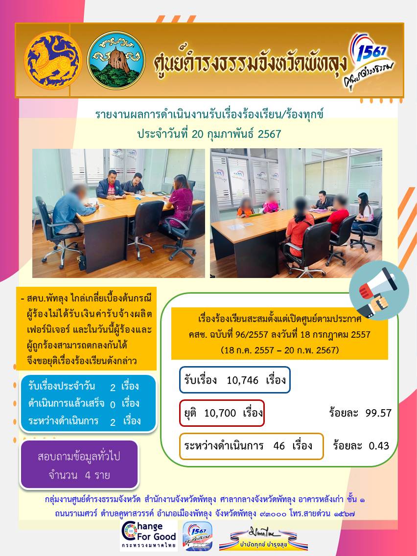 สถิติรับเรื่องร้องเรียน/ร้องทุกข์ วันที่ 20 กุมภาพันธ์ 2567