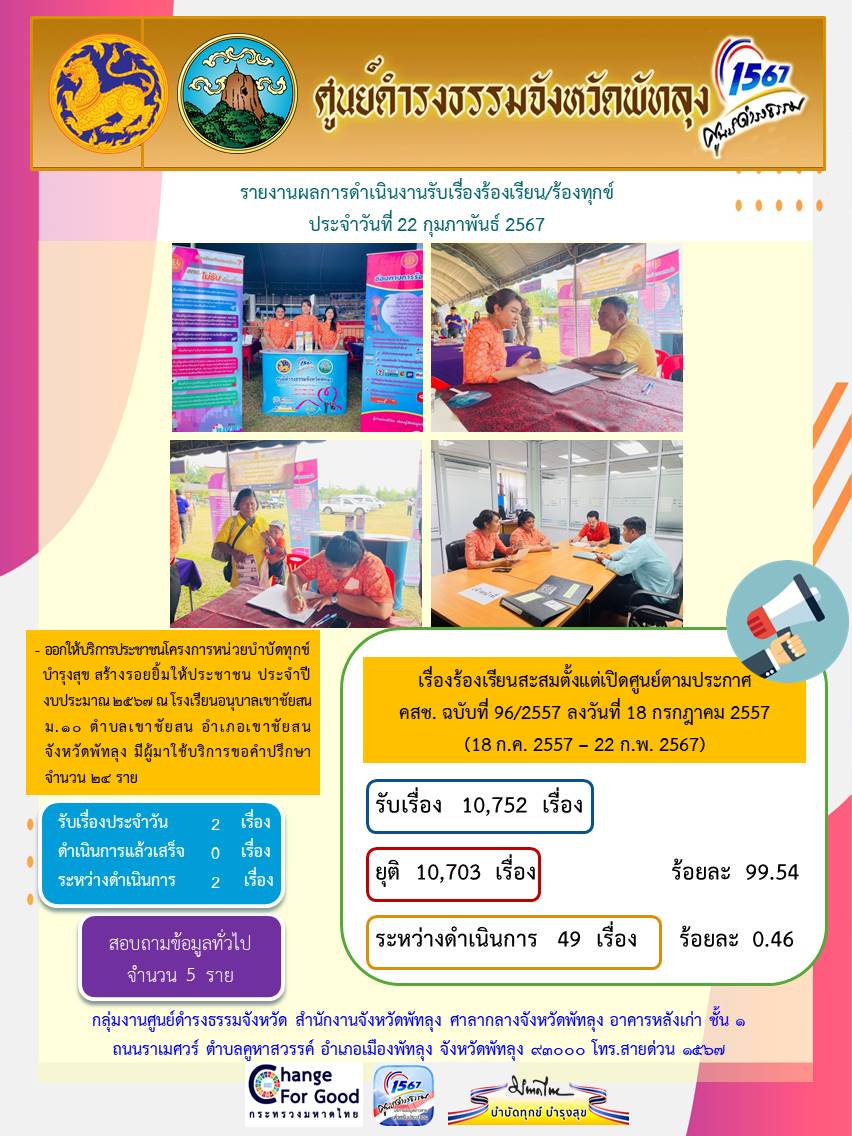 สถิติรับเรื่องร้องเรียน/ร้องทุกข์ วันที่ 22 กุมภาพันธ์ 2567