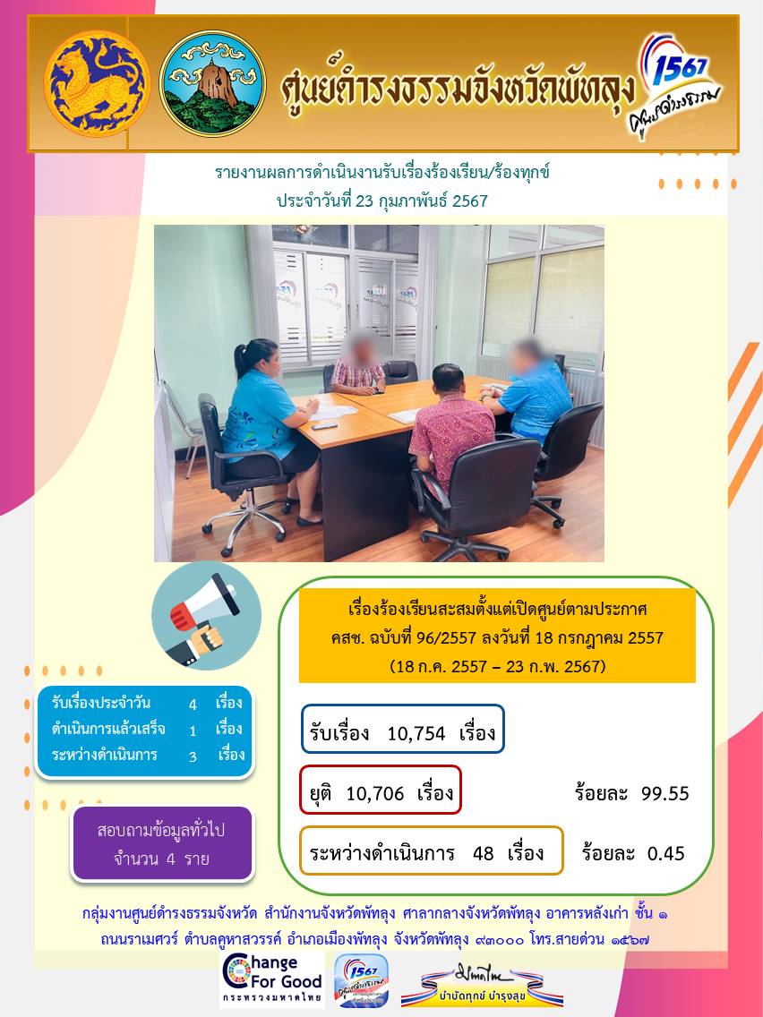 สถิติรับเรื่องร้องเรียน/ร้องทุกข์ วันที่ 23 กุมภาพันธ์ 2567