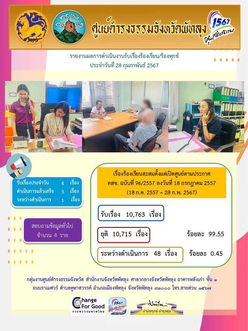 สถิติรับเรื่องร้องเรียน/ร้องทุกข์ วันที่ 28 กุมภาพันธ์ 2567