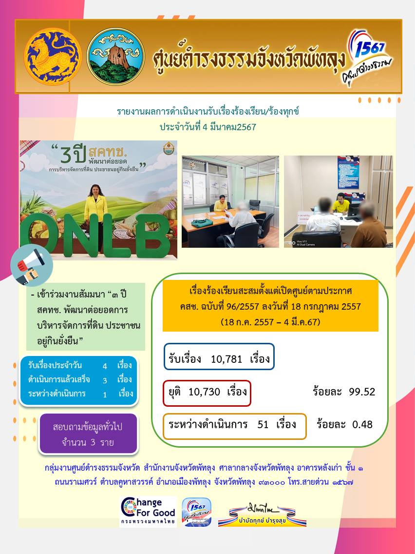 สถิติรับเรื่องร้องเรียน/ร้องทุกข์ วันที่ 4 มีนาคม 2567