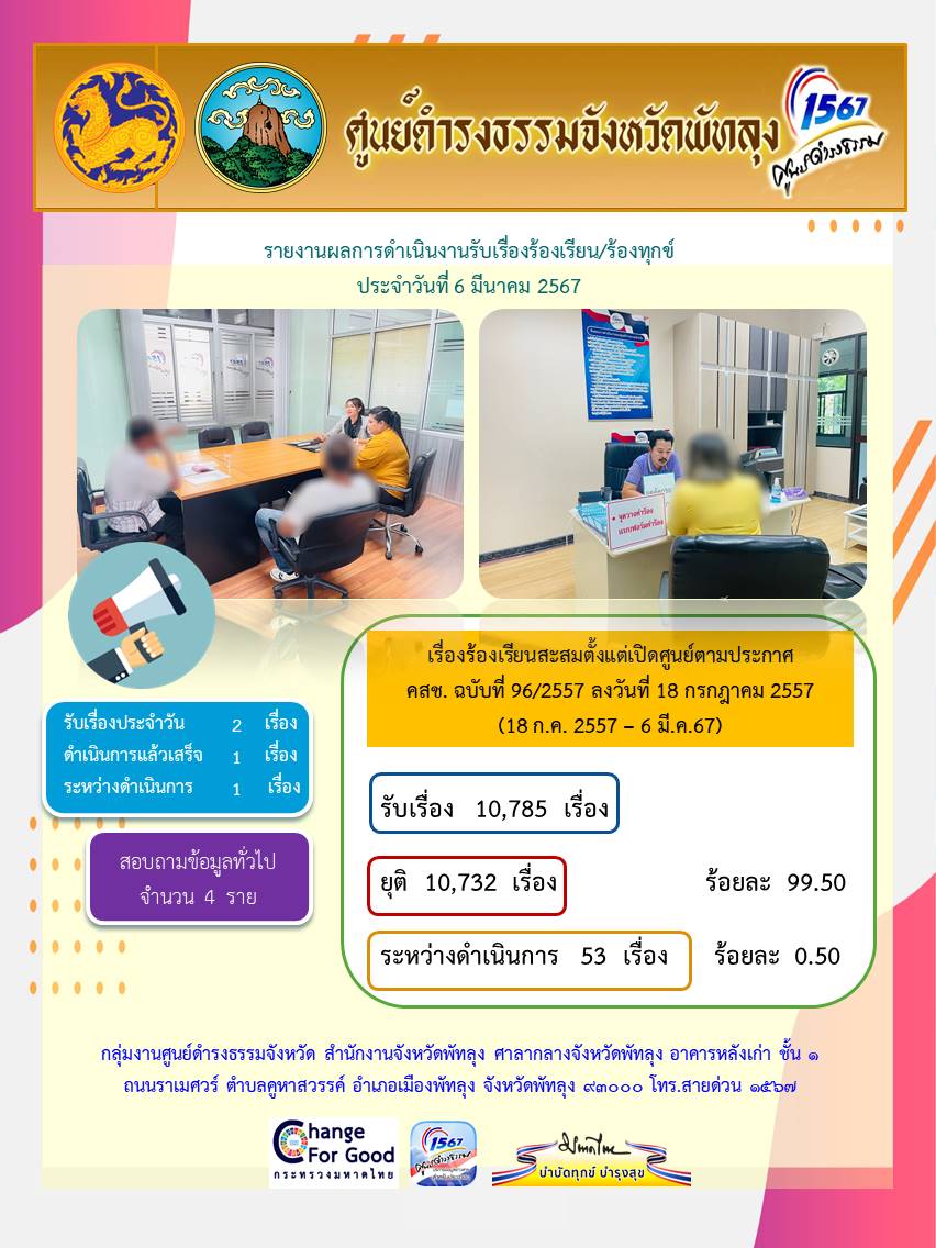 สถิติรับเรื่องร้องเรียน/ร้องทุกข์ วันที่ 6 มีนาคม 2567