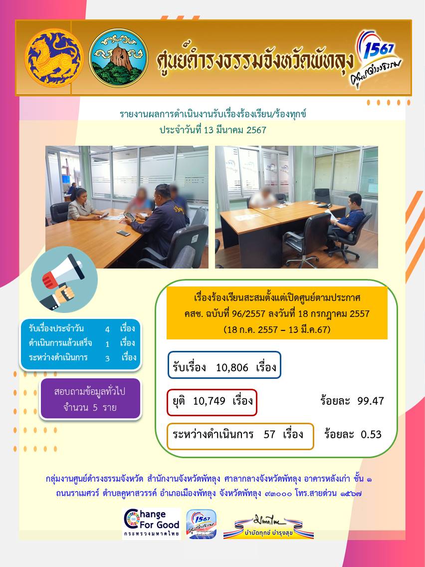 สถิติรับเรื่องร้องเรียน/ร้องทุกข์ วันที่ 13 มีนาคม 2567