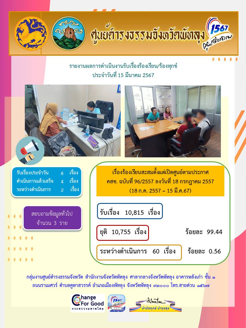 สถิติรับเรื่องร้องเรียน/ร้องทุกข์ วันที่ 15 มีนาคม 2567