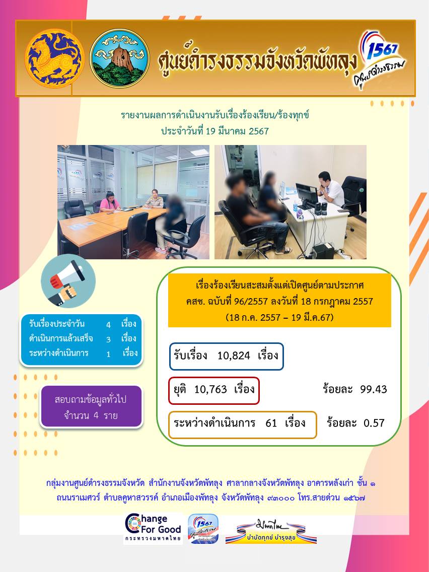 สถิติรับเรื่องร้องเรียน/ร้องทุกข์ วันที่ 19 มีนาคม 2567