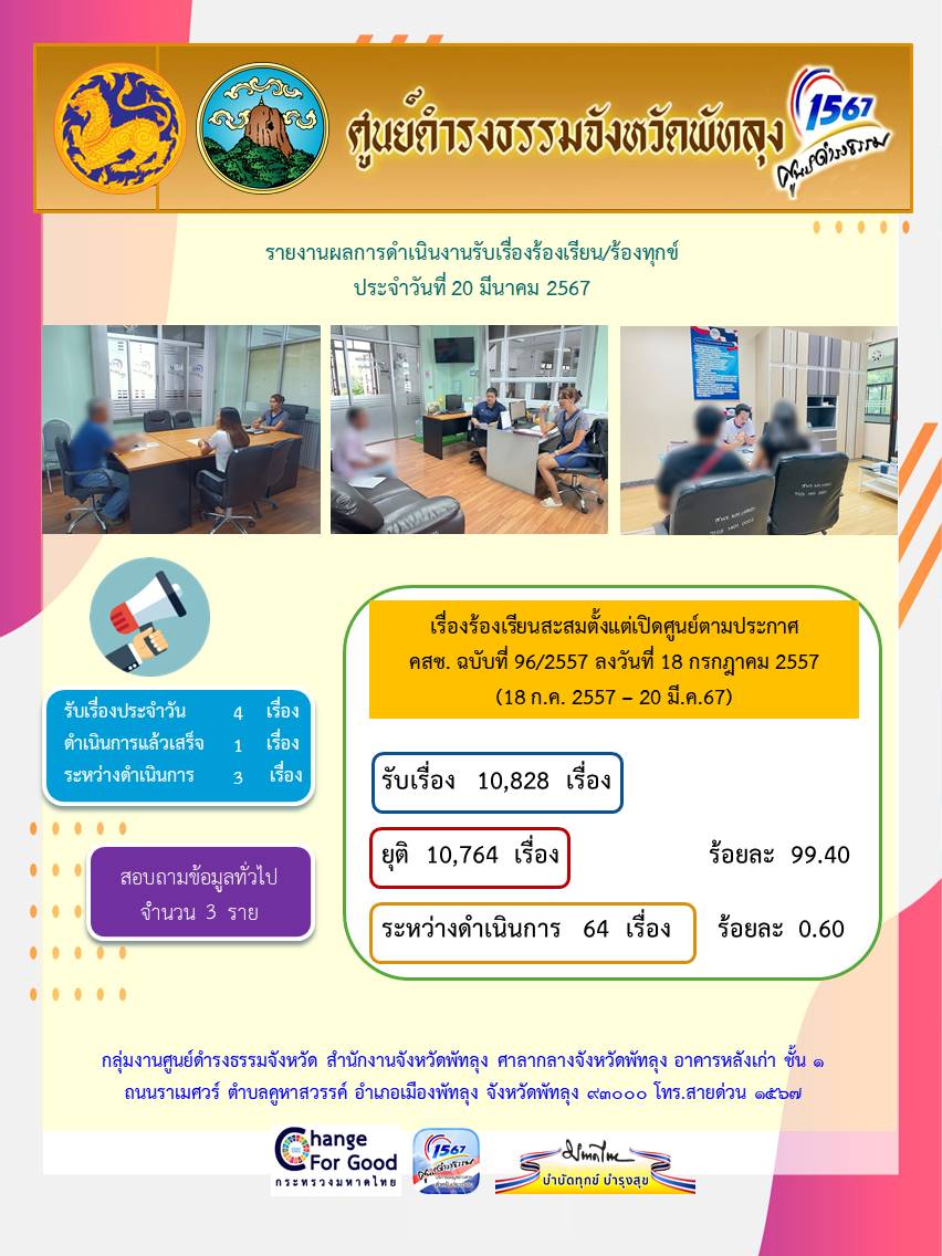 สถิติรับเรื่องร้องเรียน/ร้องทุกข์ วันที่ 20 มีนาคม 2567