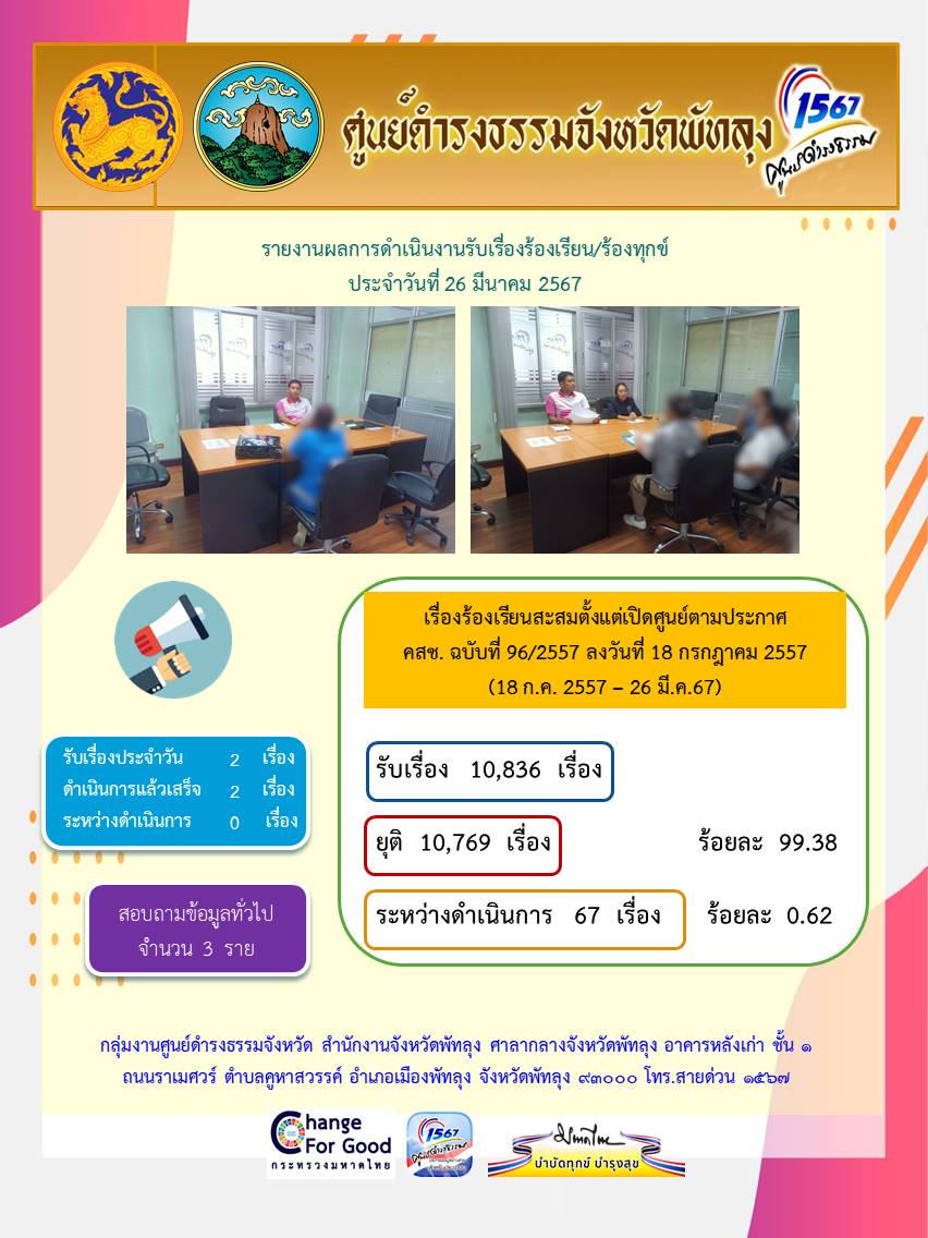 สถิติรับเรื่องร้องเรียน/ร้องทุกข์ วันที่ 26 มีนาคม 2567