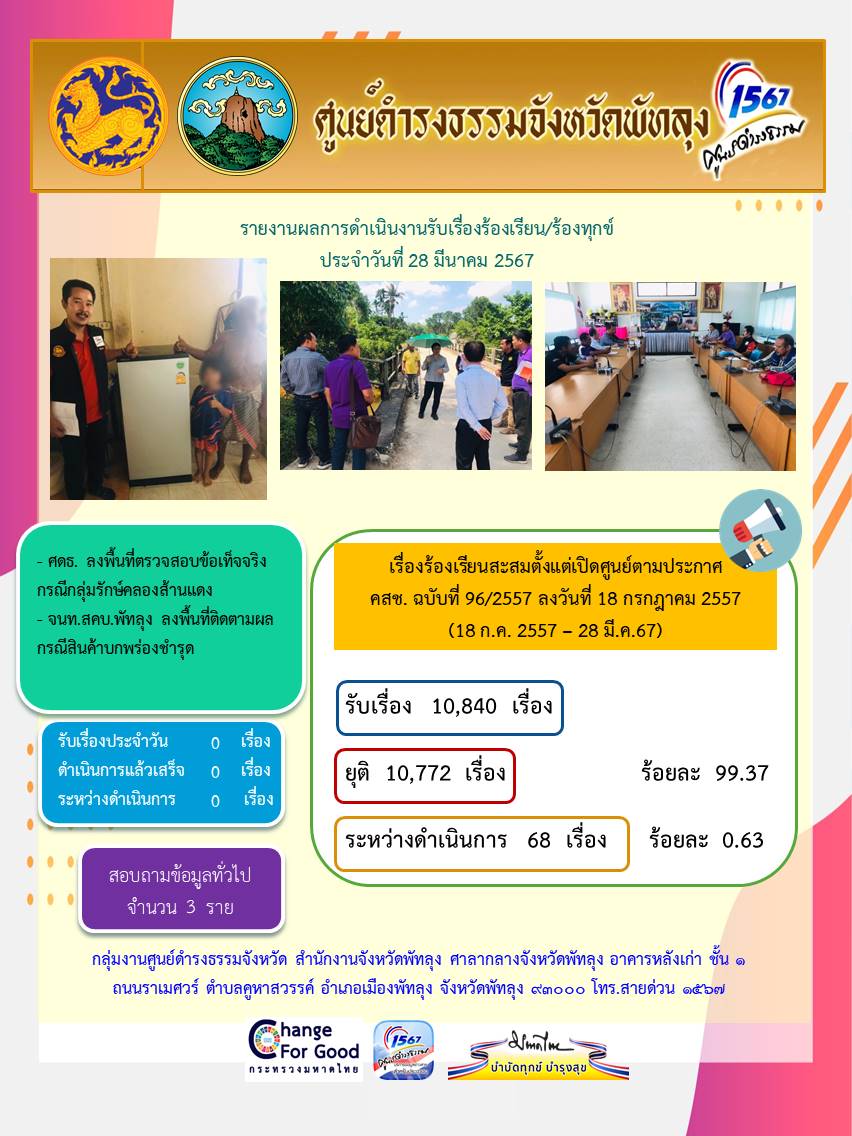 สถิติรับเรื่องร้องเรียน/ร้องทุกข์ วันที่ 28 มีนาคม 2567