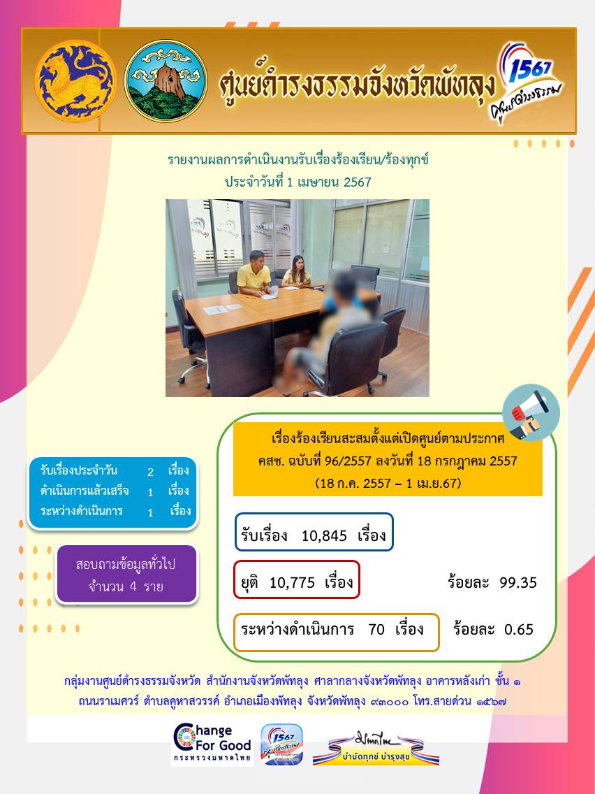 สถิติรับเรื่องร้องเรียน/ร้องทุกข์ วันที่ 1 เมษายน 2567