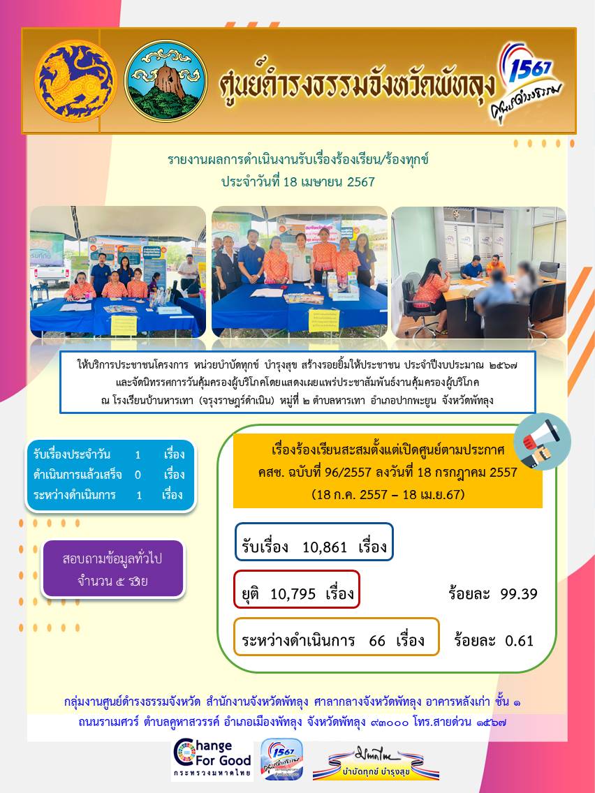 สถิติรับเรื่องร้องเรียน/ร้องทุกข์ วันที่ 18 เมษายน 2567