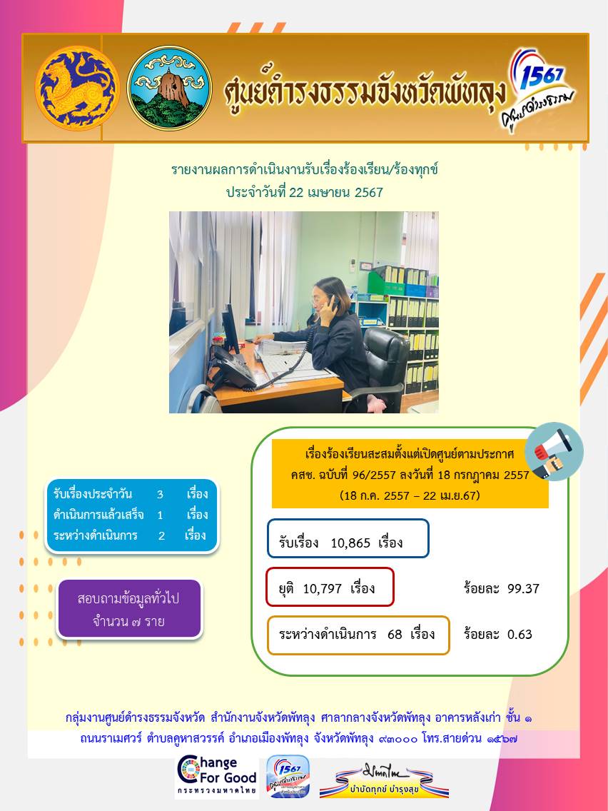 สถิติรับเรื่องร้องเรียน/ร้องทุกข์ วันที่ 22 เมษายน 2567