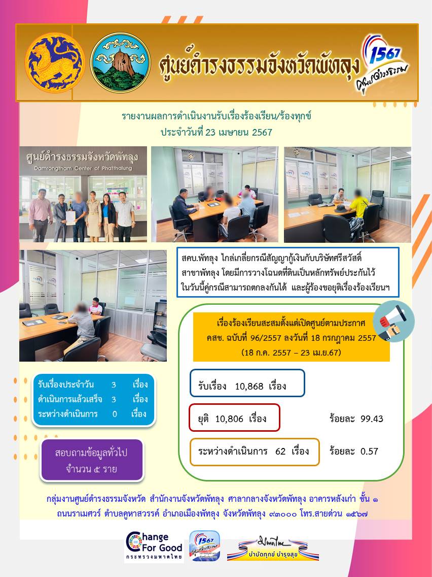 สถิติรับเรื่องร้องเรียน/ร้องทุกข์ วันที่ 23 เมษายน 2567