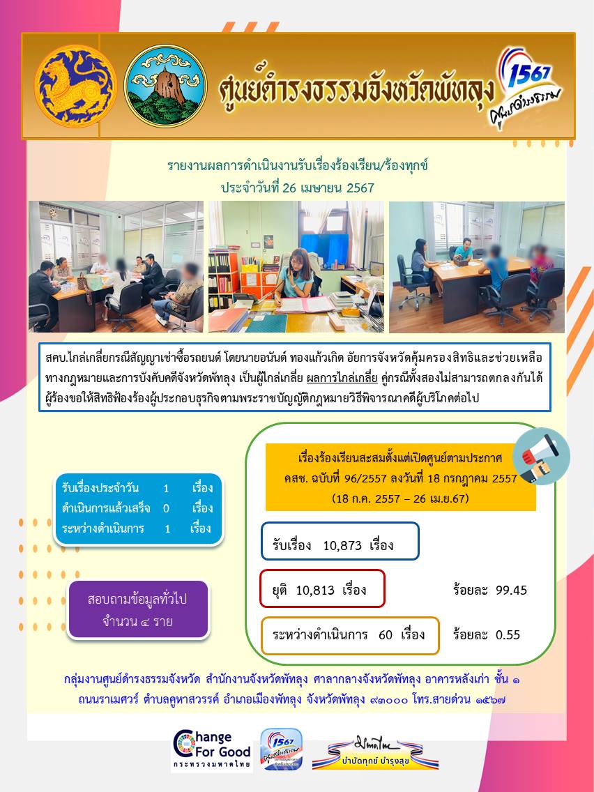 สถิติรับเรื่องร้องเรียน/ร้องทุกข์ วันที่ 26 เมษายน 2567