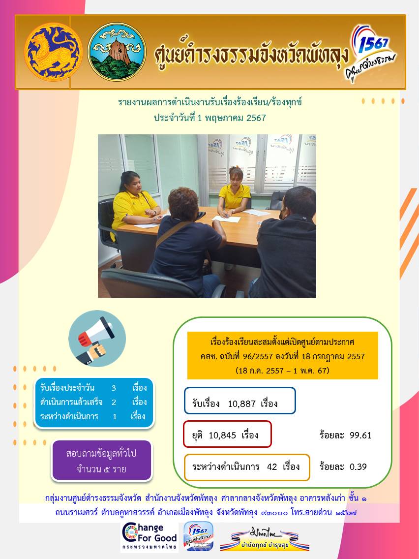 สถิติรับเรื่องร้องเรียน/ร้องทุกข์ วันที่ 1 พฤษภาคม 2567