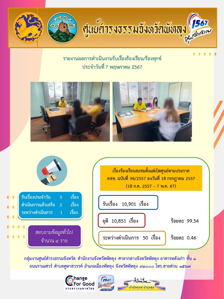 สถิติรับเรื่องร้องเรียน/ร้องทุกข์ วันที่ 7 พฤษภาคม 2567
