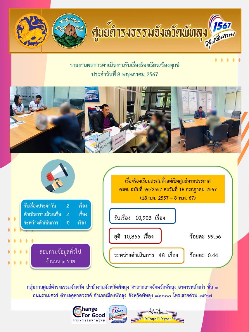 สถิติรับเรื่องร้องเรียน/ร้องทุกข์ วันที่ 8 พฤษภาคม 2567