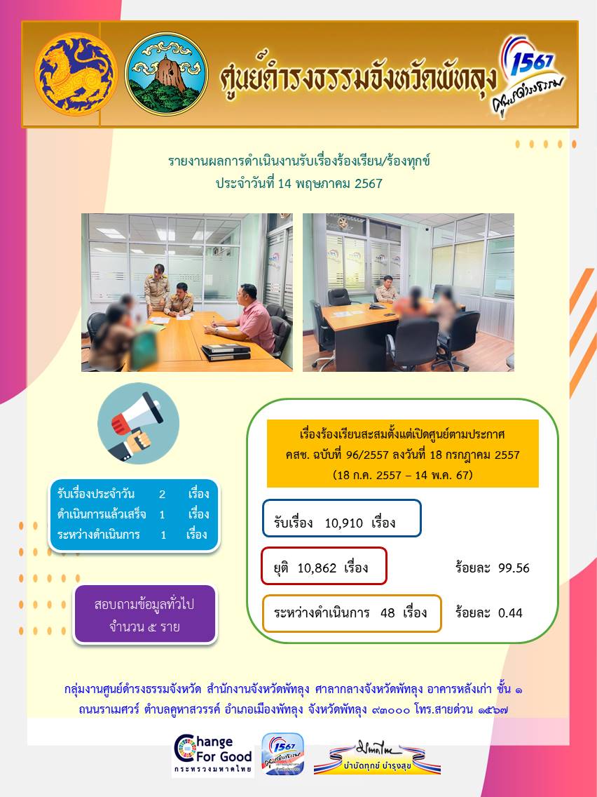 สถิติรับเรื่องร้องเรียน/ร้องทุกข์ วันที่ 14 พฤษภาคม 2567