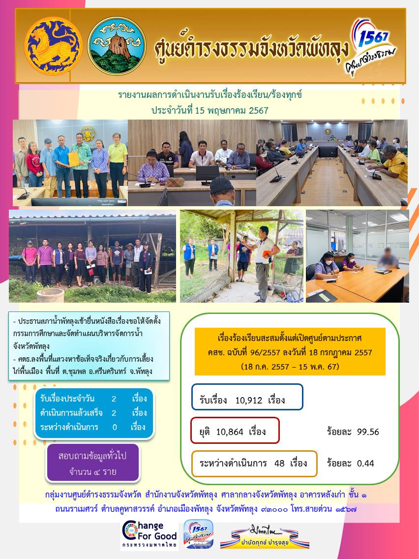 สถิติรับเรื่องร้องเรียน/ร้องทุกข์ วันที่ 15 พฤษภาคม 2567