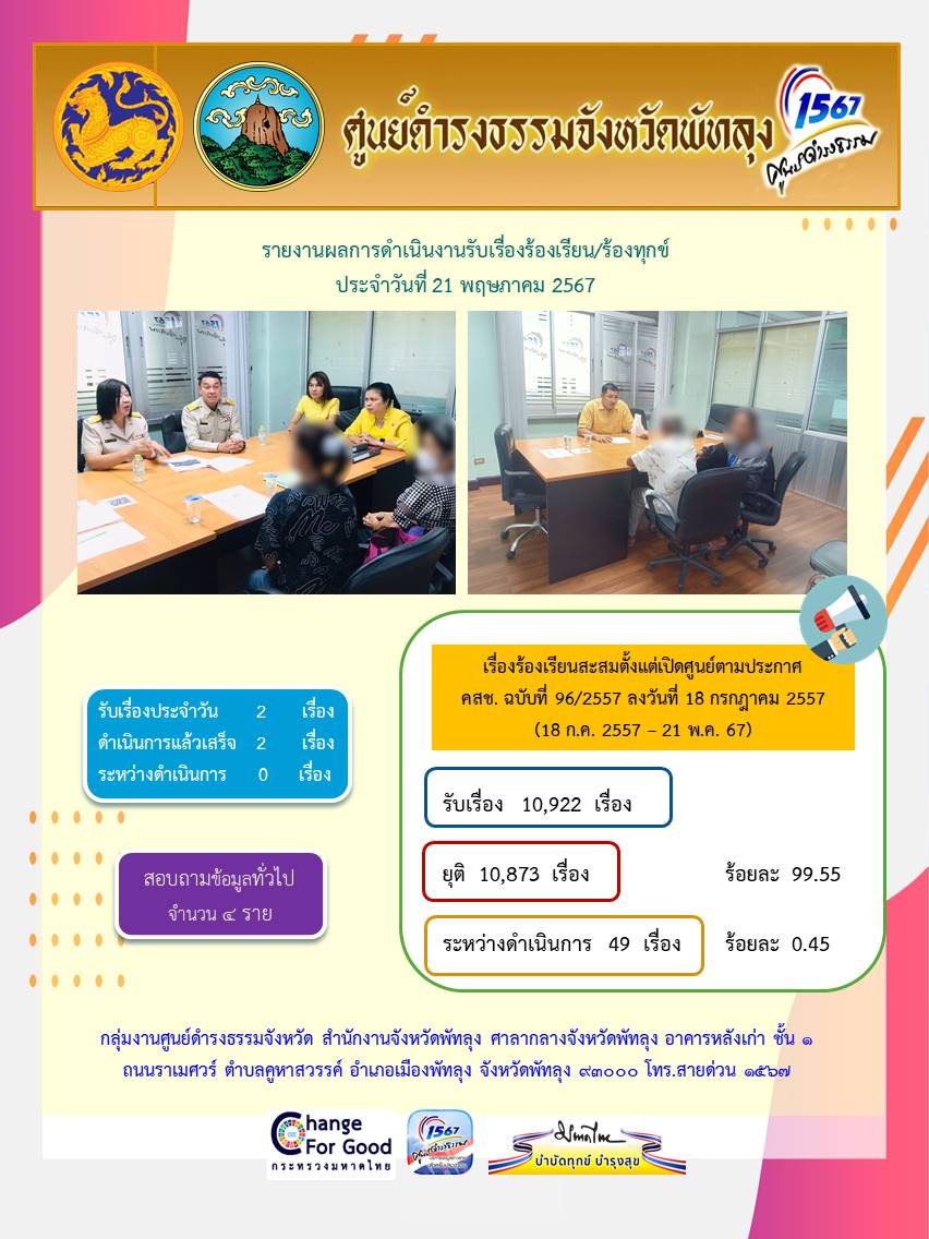 สถิติรับเรื่องร้องเรียน/ร้องทุกข์ วันที่ 21 พฤษภาคม 2567