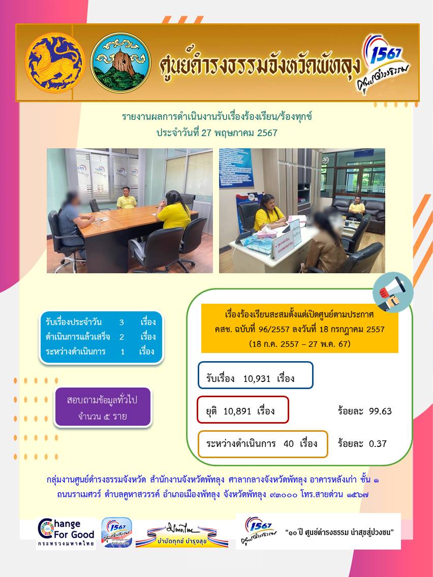 สถิติรับเรื่องร้องเรียน/ร้องทุกข์ วันที่ 27 พฤษภาคม 2567
