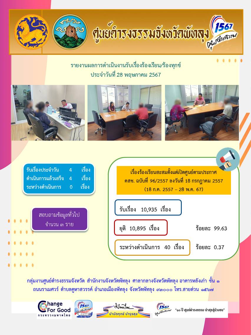 สถิติรับเรื่องร้องเรียน/ร้องทุกข์ วันที่ 28 พฤษภาคม 2567