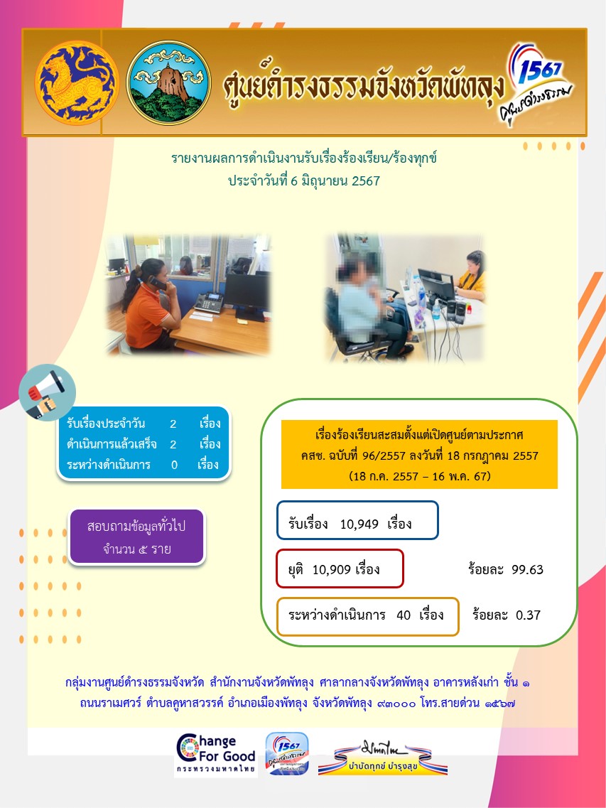 สถิติรับเรื่องร้องเรียน/ร้องทุกข์ วันที่ 6 มิถุนายน 2567