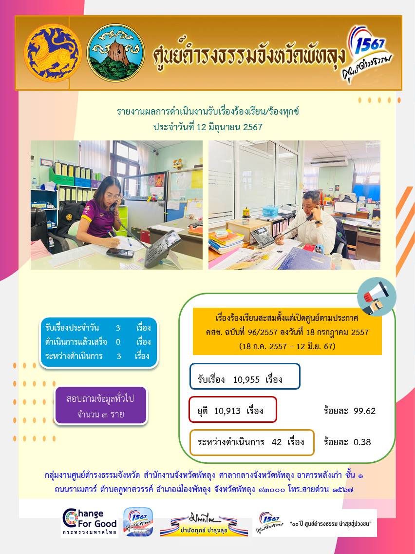 สถิติรับเรื่องร้องเรียน/ร้องทุกข์ วันที่ 12 มิถุนายน 2567