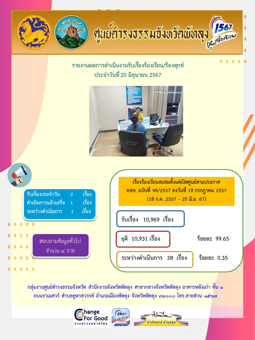 สถิติรับเรื่องร้องเรียน/ร้องทุกข์ วันที่ 20 มิถุนายน 2567