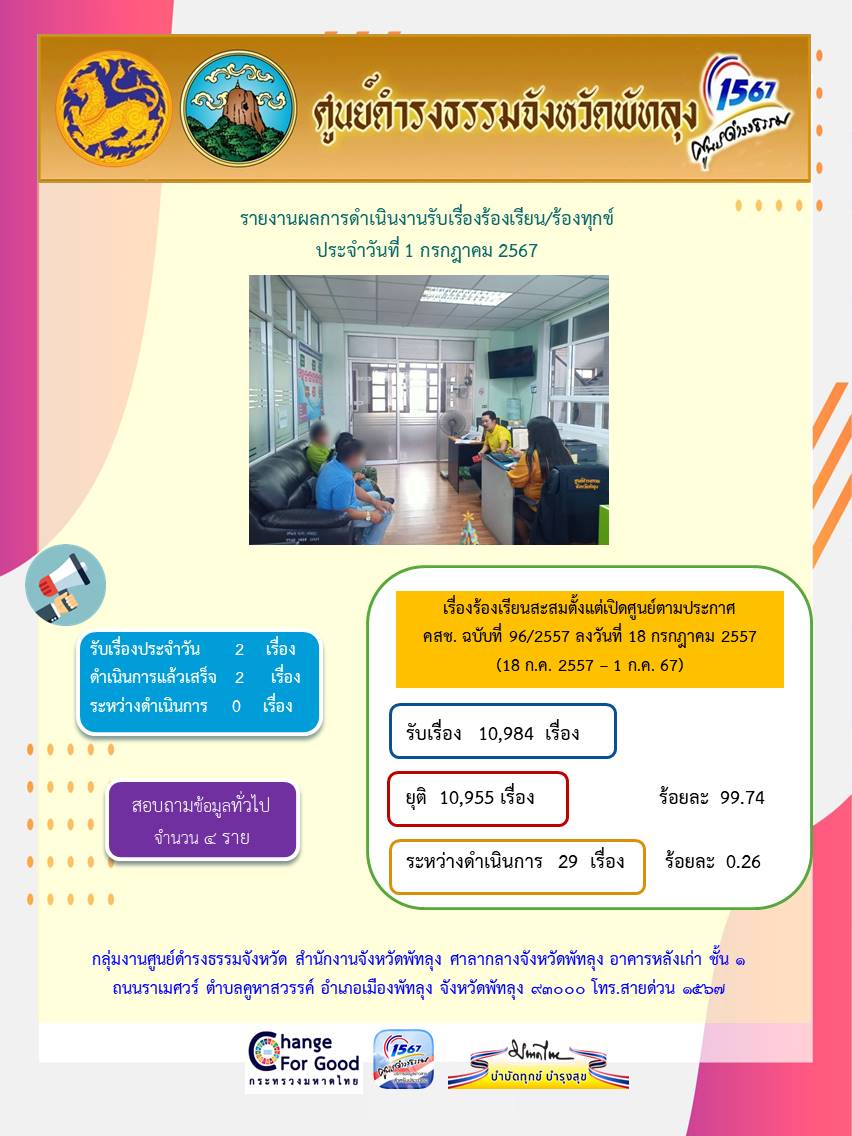 สถิติรับเรื่องร้องเรียน/ร้องทุกข์ วันที่ 1 กรกฎาคม 2567