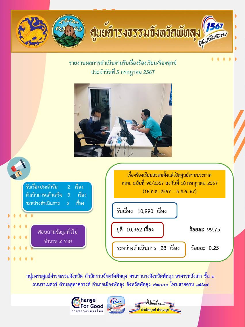 สถิติรับเรื่องร้องเรียน/ร้องทุกข์ วันที่ 5 กรกฎาคม 2567