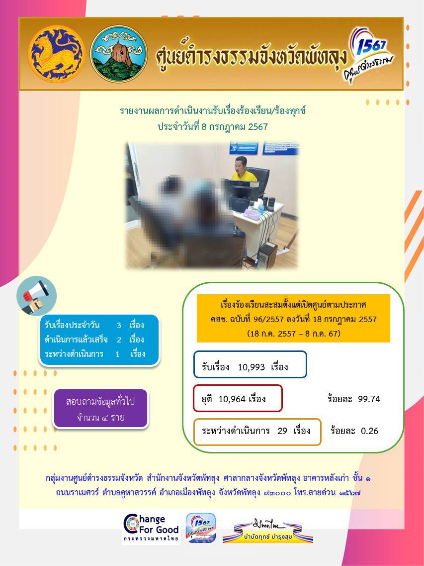 สถิติรับเรื่องร้องเรียน/ร้องทุกข์ วันที่ 8 กรกฎาคม 2567