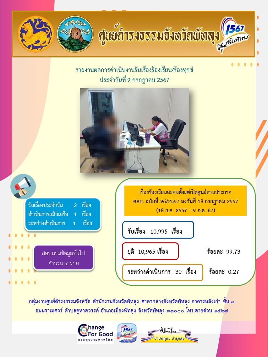 สถิติรับเรื่องร้องเรียน/ร้องทุกข์ วันที่ 9 กรกฎาคม 2567
