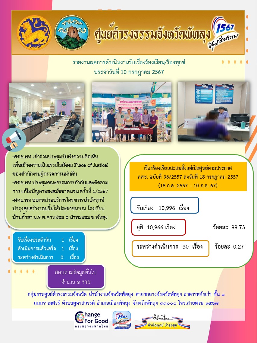 สถิติรับเรื่องร้องเรียน/ร้องทุกข์ วันที่ 10 กรกฎาคม 2567