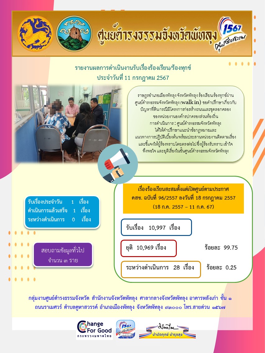 สถิติรับเรื่องร้องเรียน/ร้องทุกข์ วันที่ 11 กรกฎาคม 2567