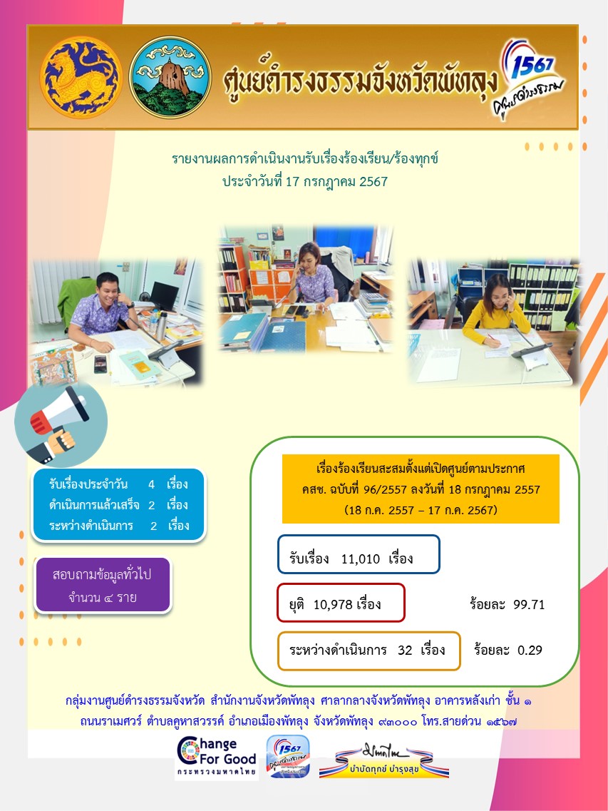 สถิติรับเรื่องร้องเรียน/ร้องทุกข์ วันที่ 17 กรกฎาคม 2567
