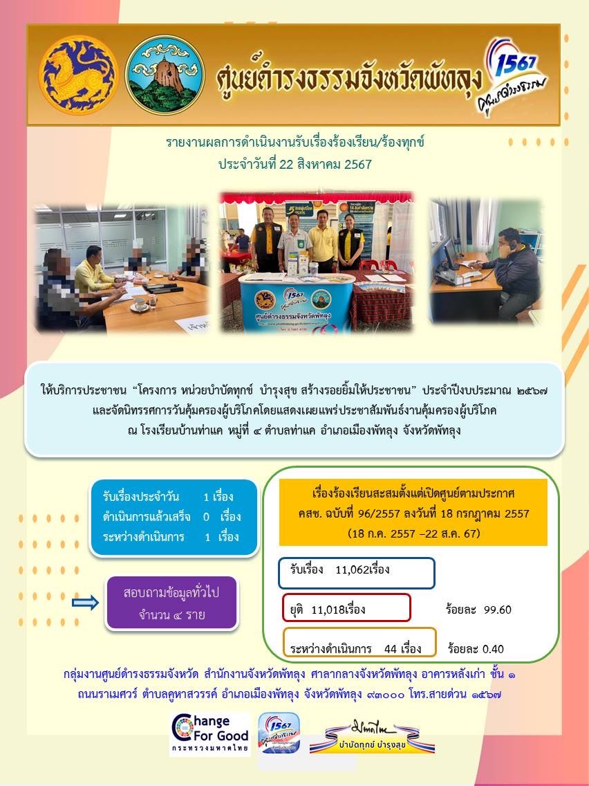 สถิติรับเรื่องร้องเรียน/ร้องทุกข์ วันที่ 22 สิงหาคม 2567