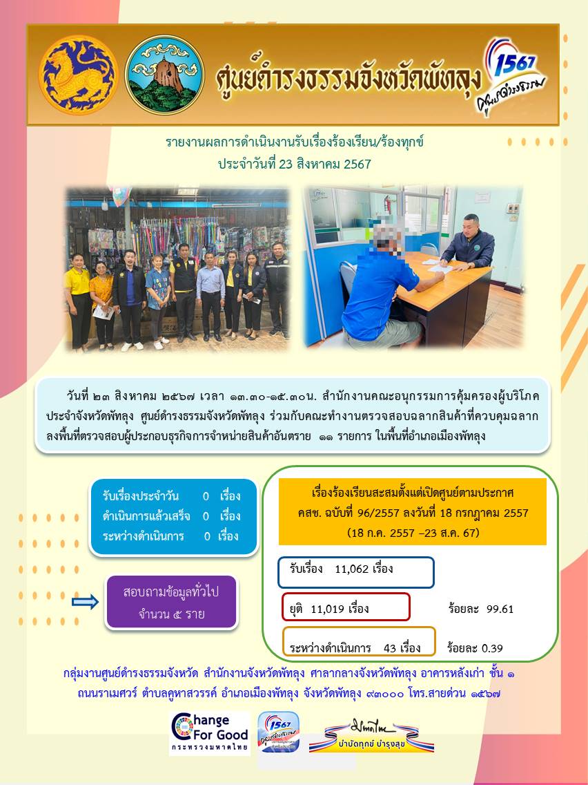 สถิติรับเรื่องร้องเรียน/ร้องทุกข์ วันที่ 23 สิงหาคม 2567