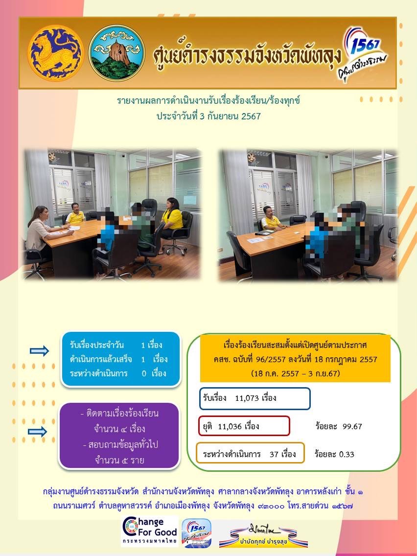 สถิติรับเรื่องร้องเรียน/ร้องทุกข์ วันที่ 3 กันยายน 2567