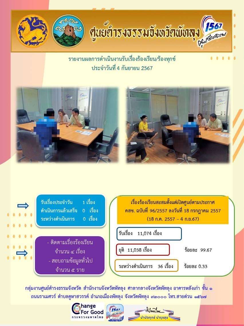 สถิติรับเรื่องร้องเรียน/ร้องทุกข์ วันที่ 4 กันยายน 2567