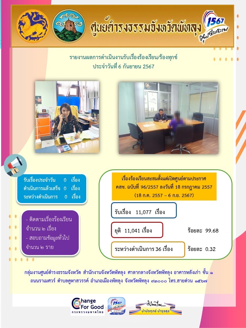 สถิติรับเรื่องร้องเรียน/ร้องทุกข์ วันที่ 6 กันยายน 2567