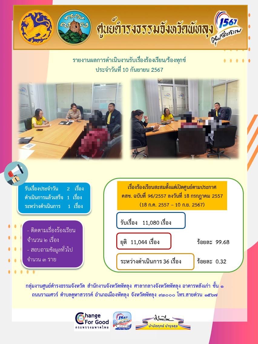 สถิติรับเรื่องร้องเรียน/ร้องทุกข์ วันที่ 10 กันยายน 2567