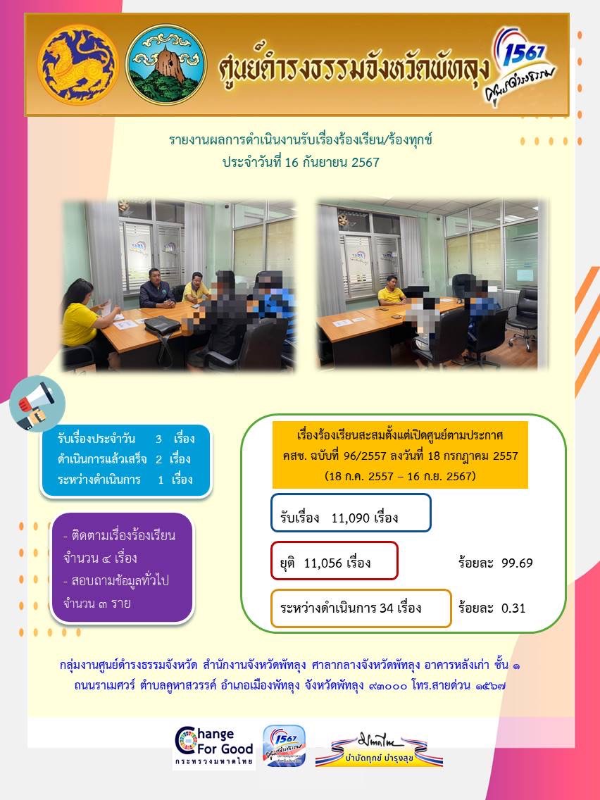 สถิติรับเรื่องร้องเรียน/ร้องทุกข์ วันที่ 16 กันยายน 2567